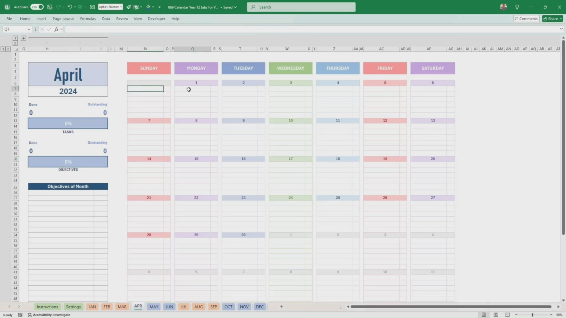 Monthly Calendar Based Excel Template Task List with 14 Tabs to track a Full year. Customize by setting the Year and Day of Week you want to start. Excel Template Easy Download. 2024, 2025 and beyond